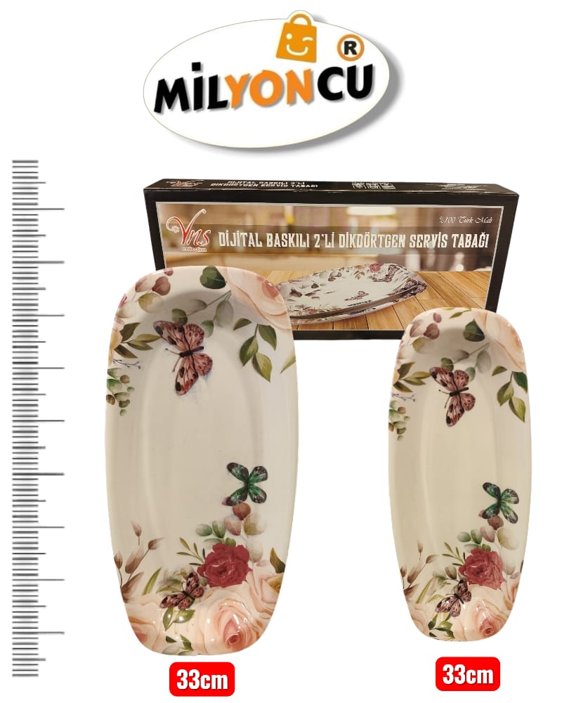 Zarif çiçek ve kelebek desenleriyle tasarlanan 33 cm dikdörtgen servis tabağı seti, geniş yüzeyi sayesinde şık ve rahat sunumlar yapmanıza olanak tanır. Hem günlük kullanıma hem de özel davet sofralarına uygundur.